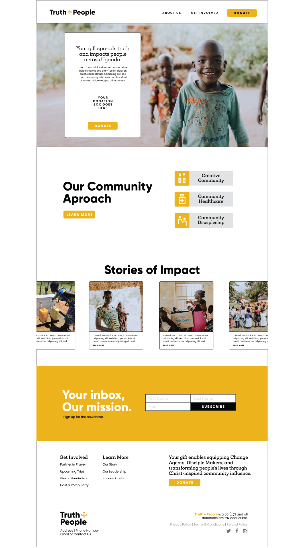 This Original image of the proposed website design included customized branding, graphics, and typography suite. We maintained minimal visuals to emphasize the mission of truth+People - consistently pointing to their donation page, ways they reach the community, local stories, and a call to action.